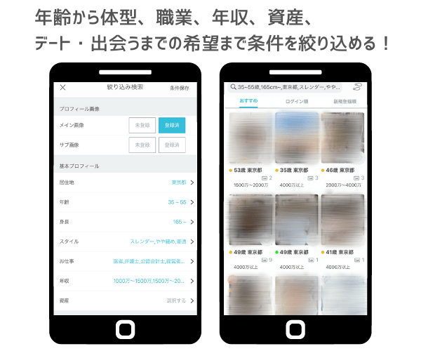 | おすすめポイント | 地方でもマッチングしやすい | 年収証明済みの ダイヤモンド会員が狙い目 | 検索機能が充実 |