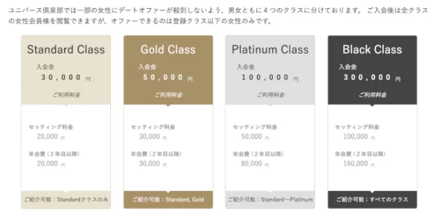 女性会員は4つのクラスに分かれており、入会時の面接で運営が容姿をもとにクラスを決定します。男性会員にも4段階のプランがあり、プランによって出会える女性のクラスが変わります。