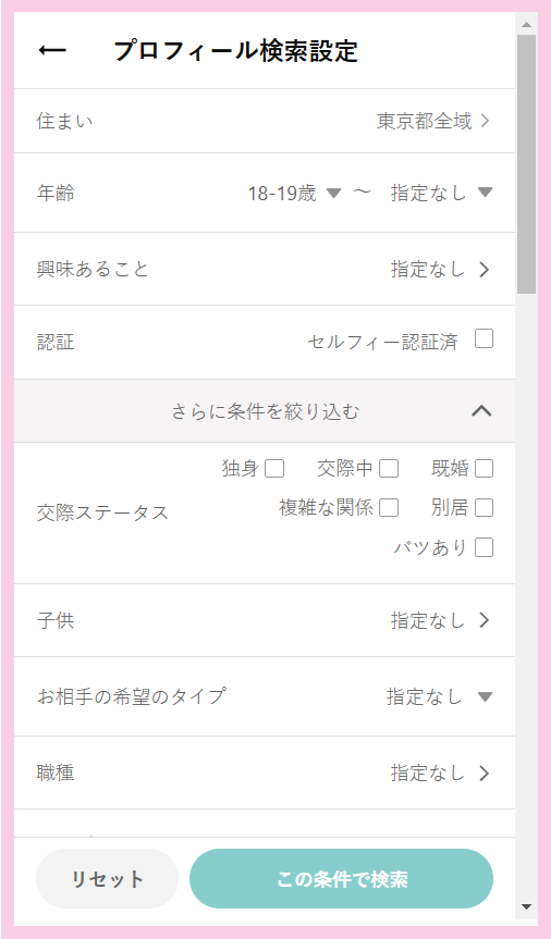 登録時には、5つの交際タイプから希望に合ったものを選択できます。